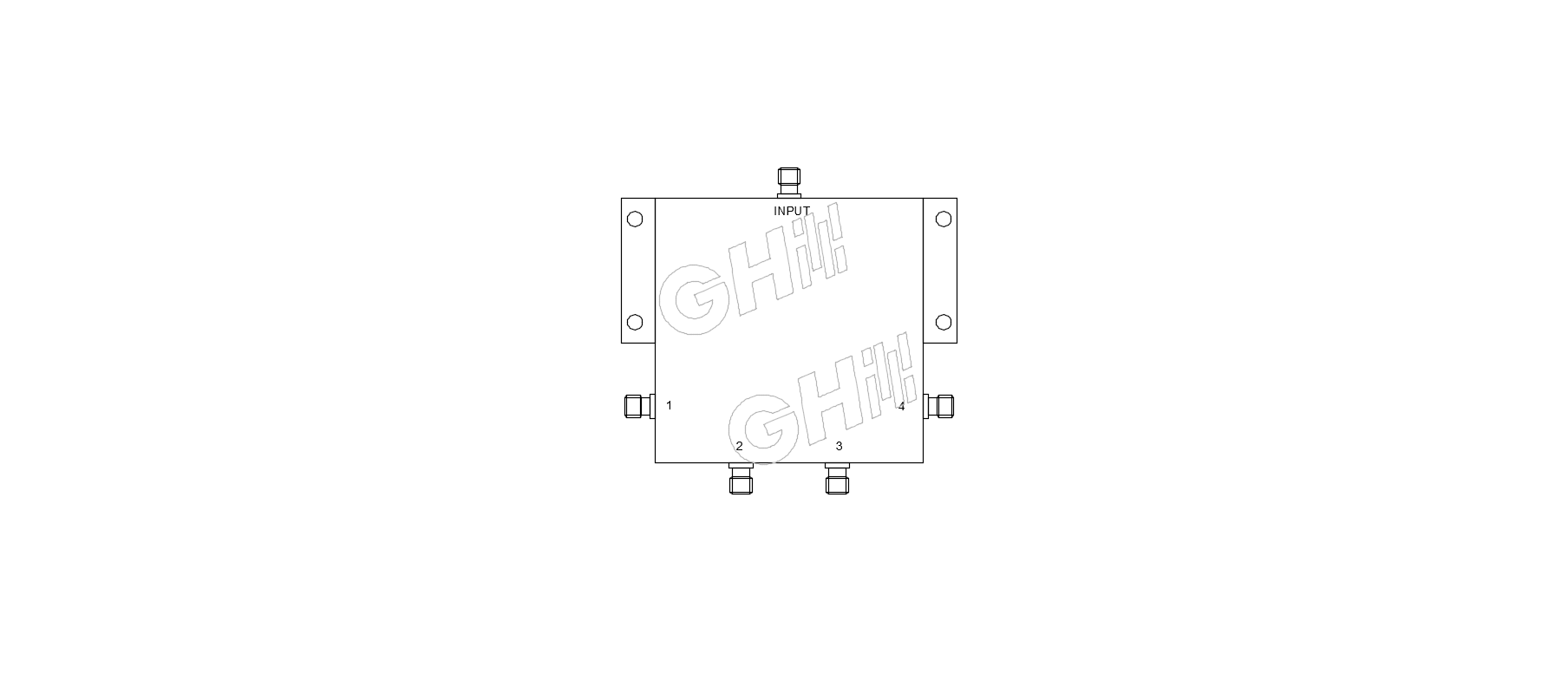 GHPD4S10.82G 4 way SMA power divider (also known as a SMA coaxial power splitter) is rated for a minimum frequency of 0.8 GHz and a maximum frequency of 2 GHz. This Goghel 4 port SMA power divider / coaxial splitter has a 50 Ohm impedance and a maxium input power of 20 Watts(cw). Our SMA coaxial RF splitter / divider has a female SMA type input and 4 female SMA output ports.