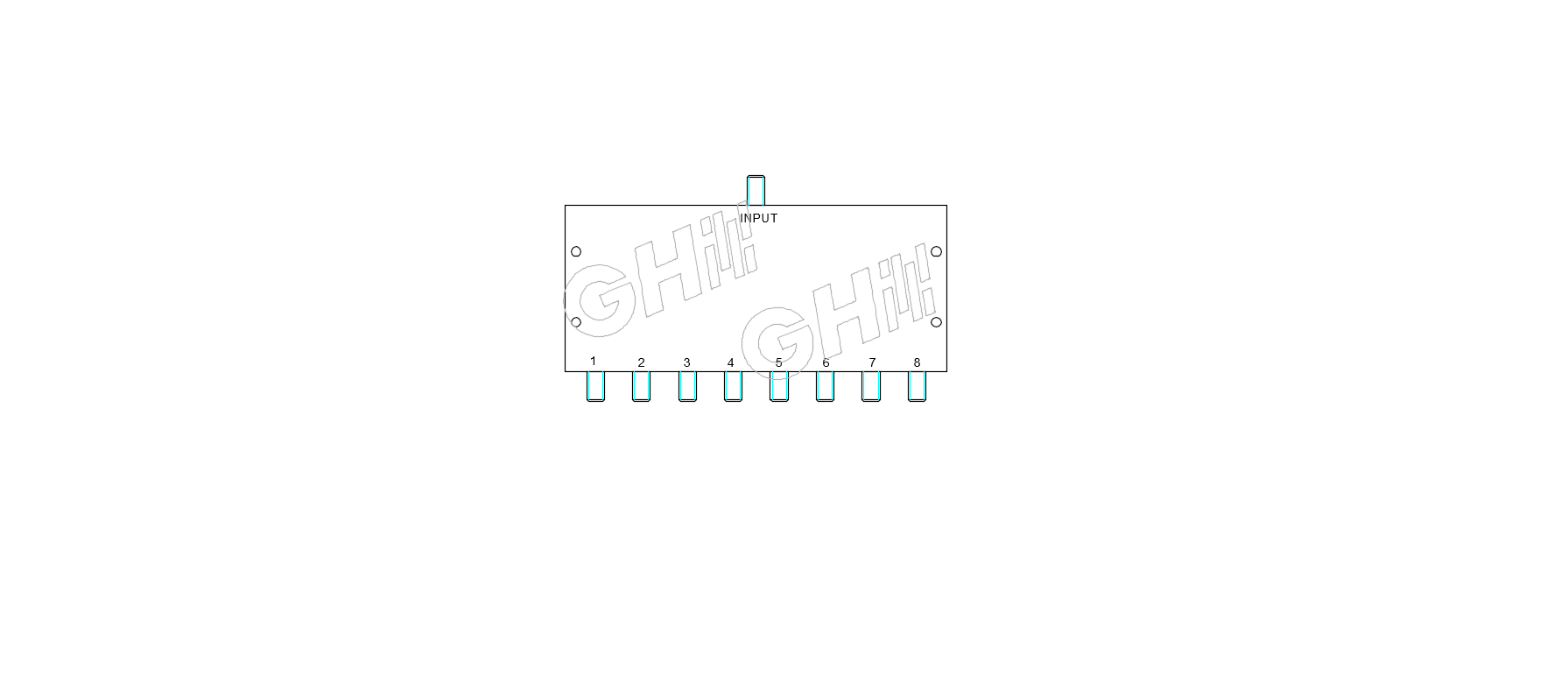 GHPD8S–9–9.6G 8 way SMA power divider (also known as a SMA coaxial power splitter) is rated for a minimum frequency of 9 GHz and a maximum frequency of 9.6 GHz. This Goghel 8 port SMA power divider / coaxial splitter has a 50 Ohm impedance and a maxium input power of 10 Watts(cw). Our SMA coaxial RF splitter / divider has a female SMA input and 8 female SMA output ports.